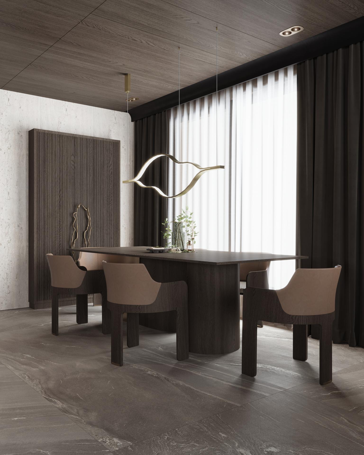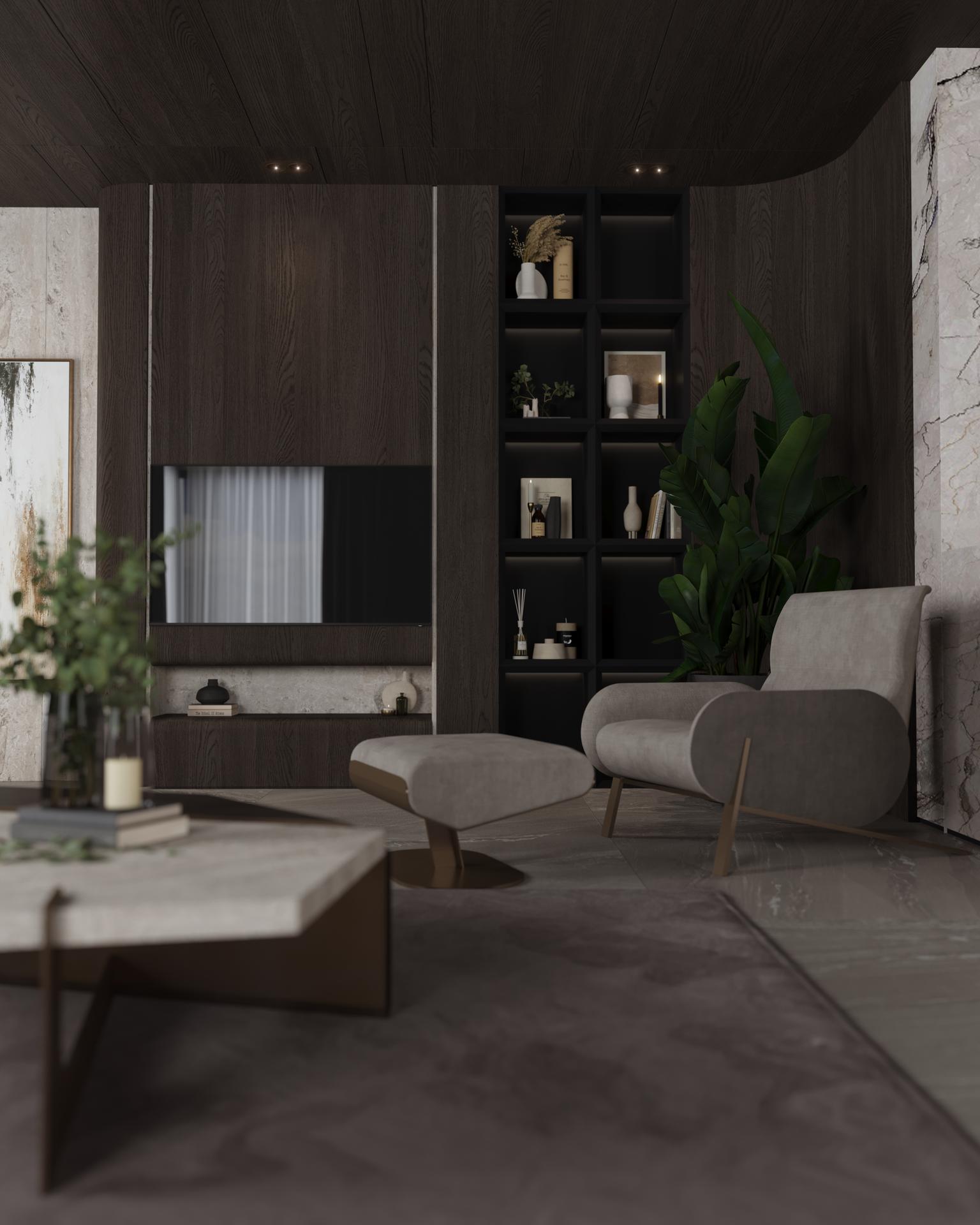 Koyu ahşap panellerle kaplanan tavan, mekana sofistike bir ‘kutu’ hissi verirken, zeminle kurduğu koyu-koyu dengeyi sağlıyor. Yemek masasının üzerindeki uzun, organik formlu lineer aydınlatma elemanı, alanın tamamlayıcı bir heykeli gibi durarak çağdaş lüks algısını pekiştiriyor. Oturma odası, koyu renkli duvar panelleri ve özel aydınlatmalı niş rafların, açık renkli koltuk ve aksesuarlarla oluşturduğu kontrast üzerine kurulu.