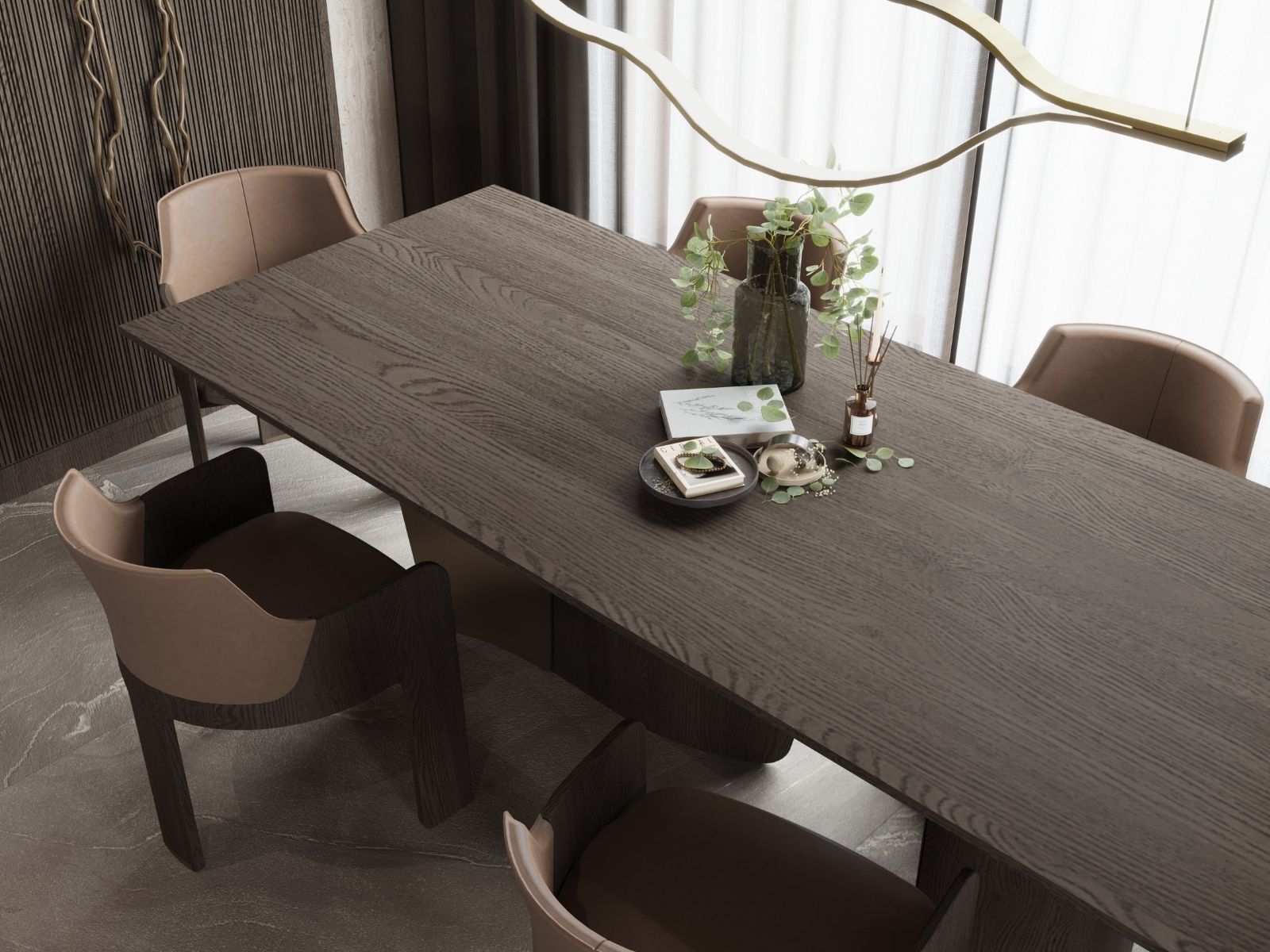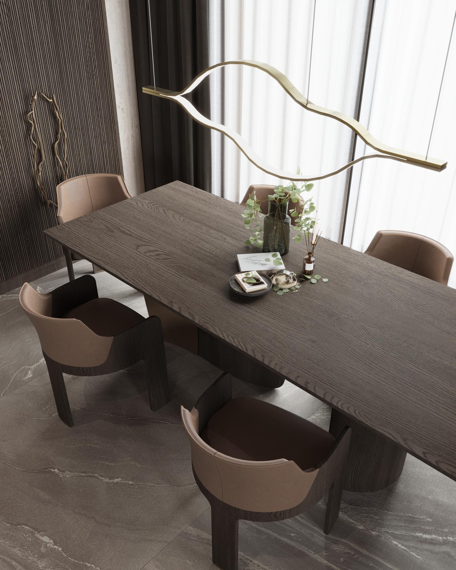Daha ilk adımda, mekanın karakteri netleşiyor: dinginlik ve zamansız zarafet. Koyu renkli geniş format zemin döşemesi, tüm alt katın temelini oluşturarak mekana derinlik katıyor. Zengin dokulu, dikey panelli duvar kaplaması, bir sanat eseri gibi çerçevelenmiş modern bir ayna ile buluşuyor. Bu alandaki odak noktası ise, işlevselliği ve estetiği birleştiren Maurizio Manzoni tasarımı Bridge Dresuar. Bridge’in yalın, metalik ve ahşap dokulu yapısı, giriş alanına anında bir incelik ve sıcak karşılama atmosferi katıyor. Müşterimizin en temel isteği olan sosyalleşme ve yemek alanının merkeziliği, bu tasarımın ana aksını oluşturuyor. Bu bölüm, koyu ahşap dokuların ve pürüzsüz taş yüzeylerin uyumuyla tanımlanıyor. Mekanın kalbinde, yine Maurizio Manzoni’nin doğadan ilham alan vizyonunun bir parçası olan ENNE Leaf Masa yer alıyor. Leaf’ın organik, zarif formu ve ahşabın sıcaklığı, alanı anında samimi bir atmosfere taşıyor. Masanın etrafında, oturum konforu ve estetik çizgiyi birleştiren Soul Sandalyeler konumlandırıldı. Soul’un ergonomik kavisleri ve deri dokusu, lüks bir konfor sunarken, masif iskeleti sağlamlığı temsil ediyor.